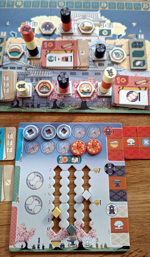 Zunächst löst dies eine Laternenaktion aus. Jeder der drei Farben ist ein Rohstoff (Reis, Stahl, Perlmutt) zugeordnet. Dieses bekommt der Spieler. Im Verlauf des Spieles kann er die Reihen über Karten ausbauen und erhält dann weitere Rohstoffe oder auch Zahlungsmittel (Gold, Lotus).