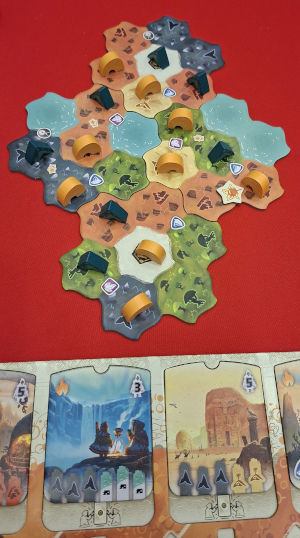 Zunächst wird ein variabler Spielplan erstellt, indem pro Spieler zwei Spielpläne mit sieben sechseckigen Feldern aneinander gelegt werden. Auf den am weitesten auseinanderliegenden Teilen befinden sich die Startfelder für die Spieler, die sie mit einem Zelt markieren.