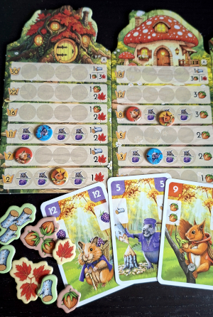 Was anders ist in Fox Grove sind die Belohnungen und die Art, wie die Spieler sie erhalten. Jede Karte zeigt am Rand eine Belohnung. Auf der 1 bis zur 11 sind Holz, Nuss und Ahornblatt. Auf der 12 ist eine Brombeere, die entweder ein Joker ist oder Siegpunkte bringt. Ein Spieler bekommt die Belohnung von seiner Karte, wenn er mit einer Fehlfarbe nicht bedient und nimmt seine Karte dann aus dem Stich. Der Gewinner eines Stichs darf sich dann eine Belohnung von allen im Stich verbliebenen Karten aussuchen.