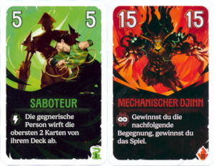 Jeder Spieler besitzt ein Deck aus 15 Karten, dass einer von fünf Farben zugeordnet ist. Pro Runde spielen wir mit fünf Karten; ein Durchgang besteht also aus drei Runden für jeden Spieler. Die KI startet und bringt nach Anweisung Gegner auf den Plan. Danach agieren wir. Jede Karte hat Symbole in vier Farben und einer Jokerfarbe.