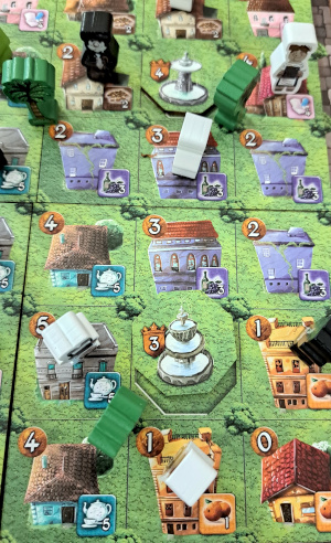 Zuletzt gibt es eine Versteigerung, um ein Haus zu versetzen. Danach stellen die beiden Amtsinhaber einen Baum und einen Brunnen auf. Der Baum gibt bei Spielende wenig, der Brunnen viel Punkte.