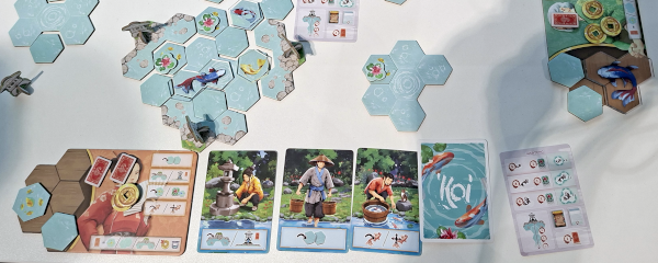 Koi (Kosmos) ist dieses Jahr das große Spiel von Kosmos. In diesem Kennerspiel bauen wir einen Teich für die Koi (=Fische). Den Teich können wir vergrößern und mit Fischen bestücken. Es geht darum, am Ende den wertvollsten Teich zu besitzen.