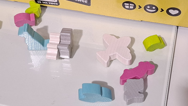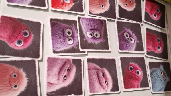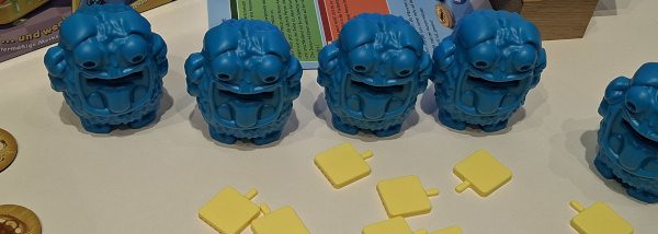 Plush-o-mat (Haba) lässt uns bis zu drei angrenzende Monster aus dem Raster nehmen. Für jedes Monster erhalten wir einen Schritt auf der ihm zugehörigen Punkte-Skala, die nicht linear ist. Einige Monster erlauben sogar, einen fremden Anzeiger zurückzubewegen.