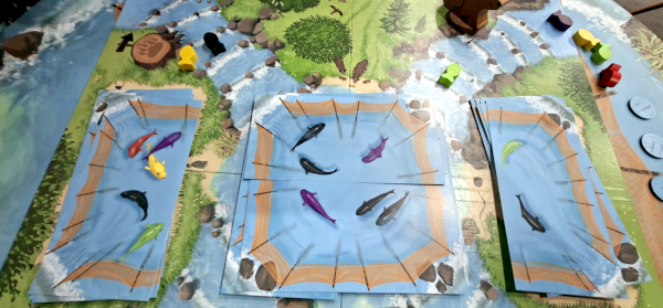 In Flitze Flatze Bärentatze (Zoch) fangen wir Lachse. Wir überdecken jeweils die Hälfte des Sees und öffnen oder Schließen damit den Abfluss und verändern damit die Fischfarben und Zahlen. Dann dürfen wir für jede vorhandene Farbe einen Fisch so viele Schritte nach unten schwimmen lassen, wie seine Farbe vorhanden ist. Sind mindestens drei Fische einer Farbe vorhanden, macht sich ein Bär auf den Weg, und frisst alle Fische, auf die er trifft. Der, dessen geheime Farbe die meisten Fische freilässt gewinnt.