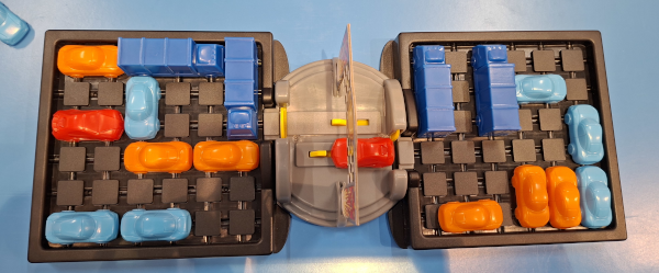 In Rush-Hour (Ravensburger) bekommen zwei Spieler die gleiche Solitäraufgabe und versuchen, das rote Auto in die Mitte zwischen beiden Auslagen zu schieben. Wer dies schafft, blockiert den Weg für den anderen und hat gewonnen.