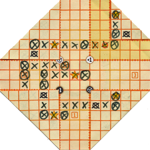 In der Mitte des Zettels gibt es schon zu Beginn einen Zielpunkt. Im Laufe des Spiels kommen vier weitere über die Ecken hinzu. Wer zuerst diese fünf Zielpunkte miteinander verbunden hat, gewinnt das Spiel.