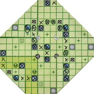 Sind in einem kleinen Quadrat die drei Smileys angeschlossen, darf die Ecke geknickt werden. Von der Rückseite kommen nun ein neuer Startpunkt und ein Zielpunkt zum Vorschein. Es können auch mehr Smileys erreicht werden, dann darf eine größere Ecke geknickt werden. Dies gibt einen Bonus: Entweder darf von nun an einer der Würfel immer genutzt werden, also auch, wenn der am Zug befindlich Spieler ihn wählt, oder eine der Zahlen darf um Eins erhöht werden.