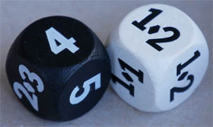 Das Spiel kommt mit zwei Würfel aus: Der weiße zeigt Zahlen zwischen 1 und 3. Auf fünf seiner sechs Seiten befinden sich zwei Zahlen. Der Werte des schwarzen Würfels liegen zwischen 2 und 5. Hier sind es nur drei Seiten, die zwei Zahlen aufweisen.