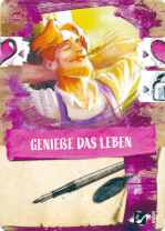 Zu Beginn des Spiels haben wir ein Kartendeck, das aus zehn Karten besteht und einen persönlichen Spielplan. Außerdem gibt es eine Auslage mit Musen (auf Karten) und weiteren Karten, die das Künstlerleben darstellen.