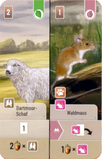 Der Ablauf des Spiels ist identisch mit Mischwald. Daher hier nur eine Kurzbeschreibung: Wir spielen Karten von unserer Hand aus. Moore (nur Dartmoor) und Bäume sind Startkarten für weitere Karten, die wir an jede Seite (Bäume) oder zwei Karten oben und unten (Moore) anlegen können. Jede Karte hat einen speziellen Effekt und muss bezahlt werden. Oft erhält der Spieler einen Vorteil, wenn die Bezahlung mit geeigneten Symbolen erfolgt. Die Karten, die zur Bezahlung benutzt wurden, kommen in eine gemeinsame Auslage. Diese wird geleert, wenn am Ende eines Zuges dort 10 oder mehr Karten sind. Um an Karten zu gelangen, kann ich in einem Zug zwei Karten nehmen, entweder aus der Auslage oder vom Nachziehstapel. Wer mehr Details wissen möchte, den verweise ich auf die Rezension zu Mischwald.