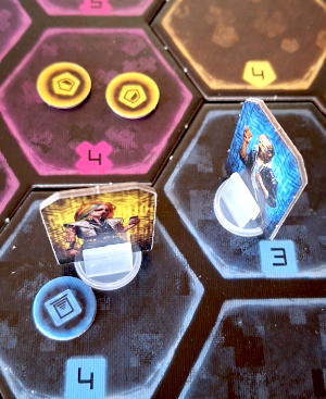 Wichtig sind für den Ablauf die Farben. Gelb bekämpft das Cluster mit List, das heißt mit Mehrheiten, während Rot den direkten Kampf sucht, der mit Würfeln entschieden wird. Grün agiert aus der Ferne und kann leicht Marken verschieben. Blau zuletzt sorgt für schnelle Bewegung der Spieler innerhalbe des Clusters. Vom Grundprinzip werden Karten mit Symbolen in den bekannten Farben gespielt. Dafür kommen hilfreiche Marken ins Spiel. Aus drei dieser Marken wiederum entsteht dann eine feste Installation, die sehr mächtig ist. Für erfahrene Spieler gibt es noch Lila als Farbe, die anders funktioniert, und daher erst mit einer gewissen Spielerfahrung ratsam ist.
