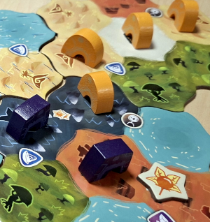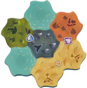 Die Landschaft besteht aus Platten, die jeweils sieben Sechsecke zeigen. Diese Sechsecke wiederum zeigen eine von fünf Landschaften: Gebirge (scwarz), Hügelland (rot); Wüste (gelb), Wald (grün) und Wasser (blau). Für den Start legen wir so viele dieser Platten aus, wie Spieler am Spiel teilnehmen. Daran bauen wir pro Spieler ein weiteres Feld, das in der Mitte ein farbneutrales Sechseck für das erste Zelt eines jeden Spielers zeigt.