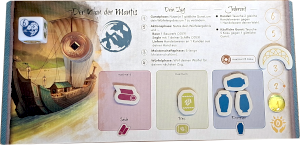 Die Schlichtheit wird dann auch auf dem Spielplan umgesetzt. Die Anzeigen und die Gebäude sind funktionell. Einen Gegensatz dazu bilden die Schiffe aus Holz und vor allem der Fluss, der nicht einfach nur blau ist, sondern viel Gold aufweist, das vermutlich Sonnenreflektionen nachstellt.