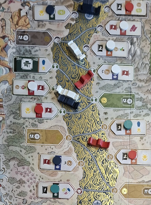 Auf diesem Fluss fährt jeder der Spieler mit zwei Schiffen. Im Spielverlauf kann er dort Gebäude errichten und Personen engagieren. Schauen wir uns das im Detail an.