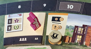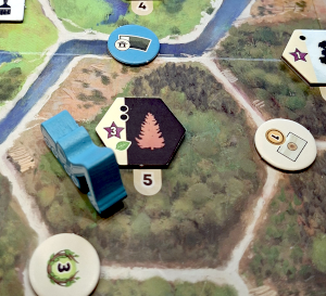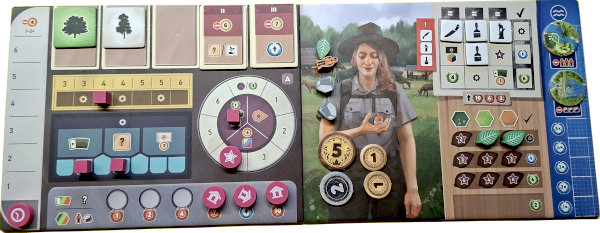 In meinem Zug führe ich Aktionen durch, die null bis zwei Aktionspunkte kosten. Ein einfaches Beispiel ist die Fahrt mit der Erntemaschine. Ich darf für einen Aktionspunkt bis zu zwei Felder fahren. Überquere ich dabei den Fluss, muss ich einen Taler zahlen. Ähnlich einfach ist das Fällen von Bäumen: Je nach Baum zahle ich einen oder zwei Aktionspunkte und bekomme pro Baum ein Holz, das ich in mein Lager lege. Dazu kann es Sternchen geben, die meinen Marker auf einem Rad bewegen. Passiert er das Feld oben auf seinen Rundkurs bekomme ich eine erstrebenswerte Belohnung. Aufforsten ist die dazu inverse Aktion, die einen Samen benötigt. Dazu kann ich noch Bäume pflegen, eine Waldhütte errichten, den Fluss renaturieren oder einen Staudamm bauen.