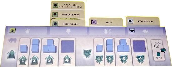 Der Spielaufbau ist hilfreich für den Einstieg. Man startet mit zwei Nahrungsquellen und zwei größeren Tieren, die die Entwicklung des Reservats zum Teil vorgeben. Dabei dienen viele der Tiere, die ich ausgespielt habe, als Nahrungsquelle für andere. Auch viele der Forschungsaufgaben beziehen sich auf Nahrungsanforderungen. Mit deren Erfüllung erhalte ich Geld für das Reservat. Gleichzeitig geben auch sie mir eine Richtung vor.