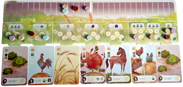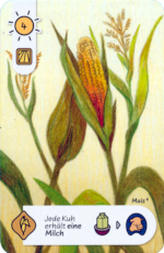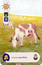 Zum Ausspielen einer Karte benötige ich Sonnenstunden. Eine Karte fordert davon eine bestimmte Menge (1 bis 10). Setze ich einen Mitarbeiter auf ein Sonnenfeld, erhalte ich zwischen zwei und fünf Sonnenstunden. Fehlende Sonnenstunden kann ich durch Münzen dazukaufen. Ich lege die Karten an ihren Ort aus und führe ihre Funktion aus. Ein Beispiel: Spiele ich eine Kuh aus, gibt sie Milch. Dazu lege ich einen meiner bis zu 15 Körbe auf die Kuh. Durch Mais erhält jede meiner Kühe eine weitere Milch (ein weiterer Korb als Anzeige). Schließlich kann der Käser aus der Milch Käse (Körbe von der Milch und aus dem Vorrat lege ich zum Käser) herstellen. Ein preiswerter Geselle erschafft drei Käse pro Milch, ein teurer Meister vier.
