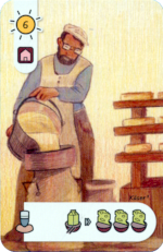 Anstelle des oben beschriebenen Spielzugs kann ich meine Mitarbeiter auch wieder zurück auf die Bank beordern. Je nach Anzahl kann ich dafür andere Aktionen ausführen, unter anderem kann ich Waren (Körbe auf Karten) verkaufen, wodurch die Körbe zu Gold werden.