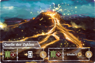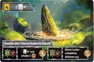 Es folgen zwei Aktionsphase. Drei Aktionen sind einfach: entweder ziehe ich zwei Karten oder ich spiele eine Karte aus oder ich schiebe Karten auf meiner Zeitleiste für zusammen zwei Felder nach vorne in der Zeit. Zusätzlich kann ich meine beschworenen Karten nutzen. Viele zeigen ein Farbsymbol. Wenn die Phase mit dem Farbsymbol übereinstimmt, kann ich den Effekt auslösen. Für die letzte Aktion gibt es Quellen. Diese sind mit Charakteren, die sich auf den Karten befinden, zu erobern. Jeder Charakter hat eine Stärke; Gegenstände haben keine Stärke. Die Quelle gibt vor, wie stark die Charaktere zusammen sein müssen, damit sie erfolgreich sind. Die Quelle gibt dem Spieler einen einmaligen Vorteil, einige dazu einen dauerhaften. Ein anderer Spieler kann die Quelle mit größerer Stärke übernehmen. Dagegen lassen sich die Quellen in einem zweiten Schritt sichern. Dies erfordert eine höhere Stärke und bringt nochmal einen einmaligen, anderen Vorteil.