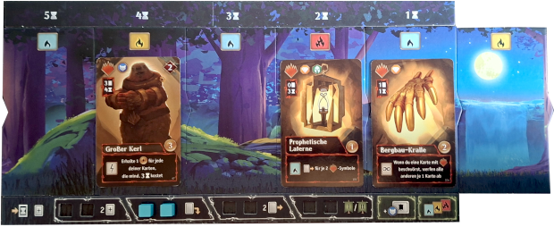 Damit dieses nun Sinn macht, legen wir Karten auf die Plättchen. Eine Karte hat zwei verschiedene Kosten. Zum einen muss ich andere Karten abgeben, zum anderen braucht die Karte Zeit, bis ich sie erhalten. Ich bekomme sie, wenn sie auf dem Plättchen liegt, das rechts herausgeschoben wird. Im Spiel heißt dies Beschwörung. Das Spiele beginnt damit, dass ich eine meiner sieben Startkarten ausspiele, also die Karten bezahle und sie auf das vorgegebene Plättchen lege. Danach folgt ein simpler Ablauf: Zunächst schieben wir das freie Plättchen in die Schiene. Dadurch wechselt die Phase (3* Blau, 2* Gelb und 1*Rot). Anschließend ziehen wir eine Karte.