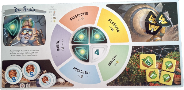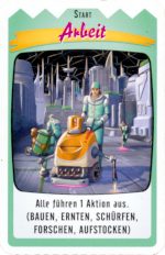 Am Anfang scheint alles in Ordnung zu sein. In vier Schichten wird gearbeitet. Gleich mehr dazu. An zwei Stellen treten leichte Probleme auf und zwei Twists helfen den Kolonien, sofern sie dies wünschen. Ach so, außerdem haben wir Pläne von vier Gebäuden (Karten auf der Hand) zum Start unserer Kolonie, dazu 30 Kolonisten, vier Nahrung und vier Geld.